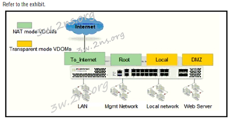 [11] Refer to the exhibit.The Root and To_Internet VDOMs are configured in NAT mode. The DMZ and Local VDOMs are configured in transparent mode.