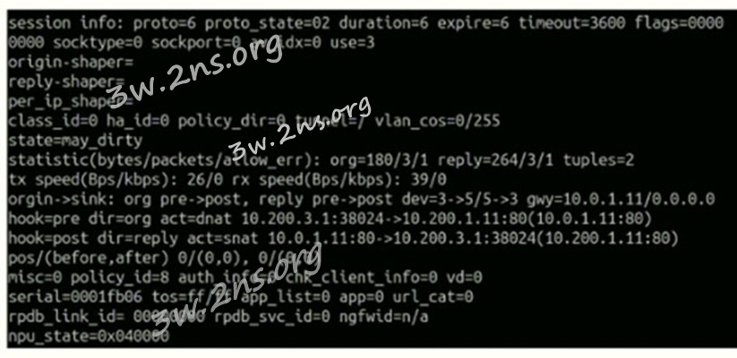 [58] Which contains a session diagnostic output. Which statement is true about the session diagnostic output? A. The session is in SYN_SENT state.