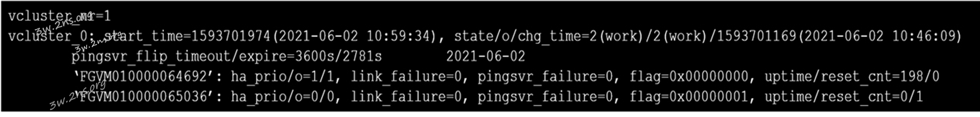 [62]Refer to the exhibit.The exhibit displays the output of the CLI command: diagnose sys ha dump-by vcluster. Which two statements are true? (Choose two.)