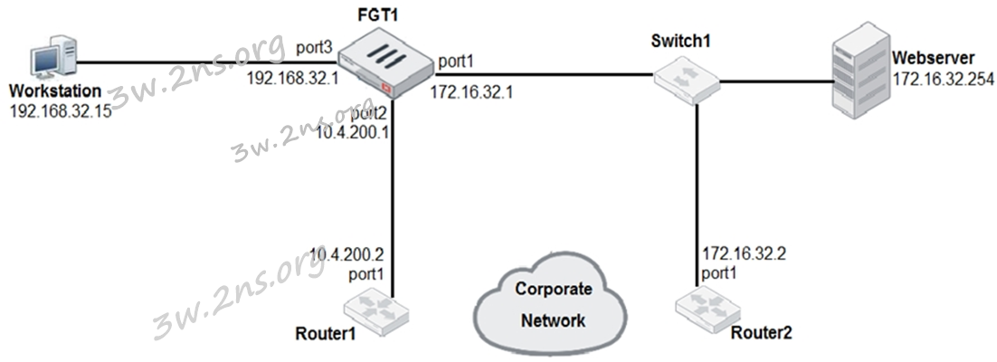 [77] Examine the network diagram shown in the exhibit, then answer the following question: Which one of the following routes is the best candidate route for FGT1 to route traffic from the Workstation to the Web server?