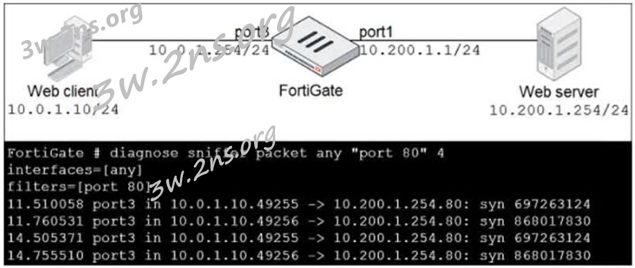 [95] In the network shown in the exhibit, the web client cannot connect to the HTTP web server. The administrator runs the FortiGate built-in sniffer and gets the output as shown in the exhibit.