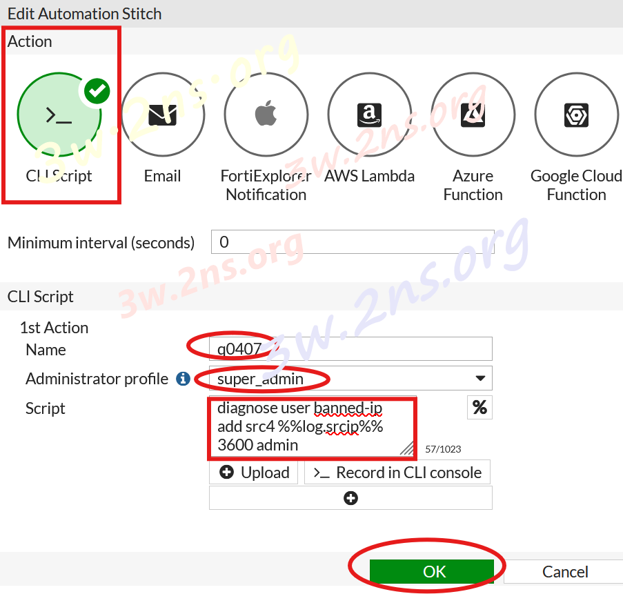 使用 FAZ 連動自動化腳本 (Automation Stitches)自動隔離攻擊的來源IP,另也可以把來源IP加入deny policy的來源IP群組,以下使用ban ip方式。