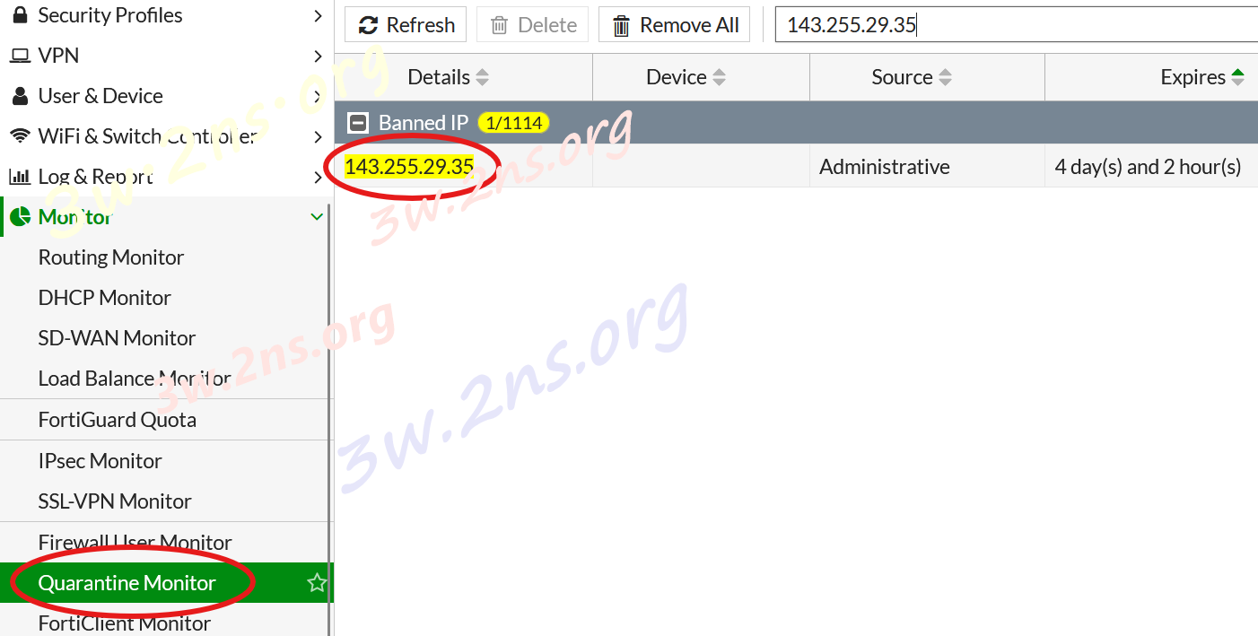 檢視FortiGate隔離清單,已有IPS入侵事件的IP被封鎖。