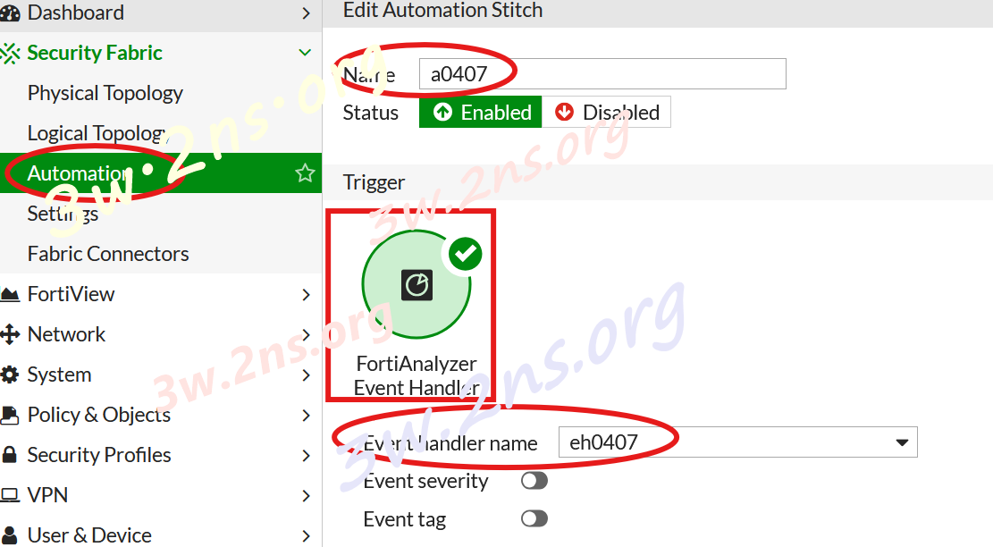 建立新的 Trigger,類型選擇 FortiAnalyzer Event Handler。